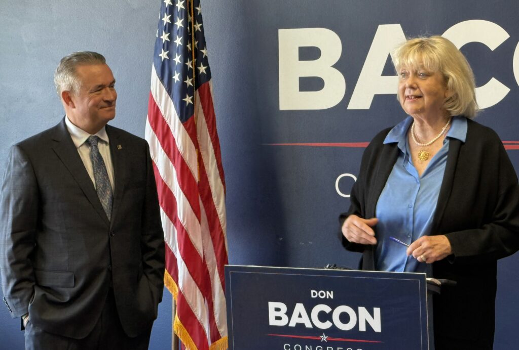 النائب الجمهوري الأمريكي دون بيكون يستمع بينما تؤيده المرشحة الديمقراطية السابقة للكونغرس آن أشفورد. (آرون ساندرفورد/ ممتحن نبراسكا)