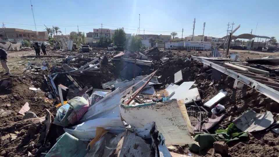القصة: تناثر الحطام والمركبات المحترقة على الأرض في مدينة الحلة العراقية، حيث قال الجيش الأمريكي إنه نفذ ضربات جوية ضد مسلحين متحالفين مع إيران يوم الاثنين.