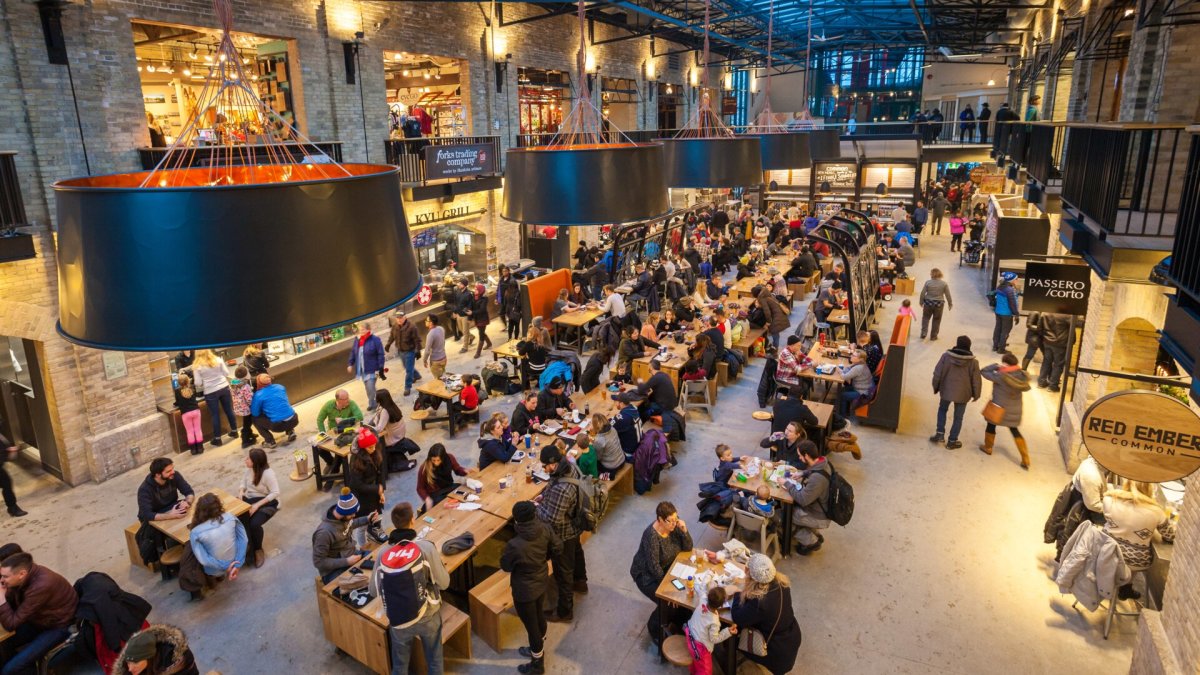 تتميز قاعات الطعام بتصميم عصري في قاعة الطعام بالمركز التجاري، حيث تضم مطاعم متعددة تحت سقف واحد. حتى أن البعض يقدم الطلب عبر رمز الاستجابة السريعة، مما يجعل من السهل تناول وجبة تأتي من مطاعم متعددة.