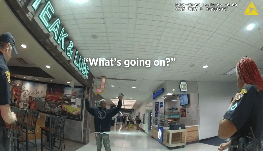 يُظهر مقطع فيديو من كاميرا الشرطة، الضباط يسيرون نحو رجل يقف في بهو المطار ويرفع يديه في الهواء، ويسألونه: “ما الذي يحدث؟”