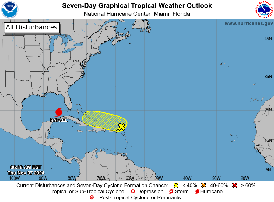 نظامان في حوض المحيط الأطلسي – إعصار رافائيل واضطراب شمال شرق جزر ليوارد – يغمران أجزاء من منطقة البحر الكاريبي، وفقًا للمركز الوطني للأعاصير. لقد اتخذ مسار رافائيل المتوقع تأرجحًا شديدًا نحو الغرب ولا تزال وجهته النهائية في حالة تغير مستمر.