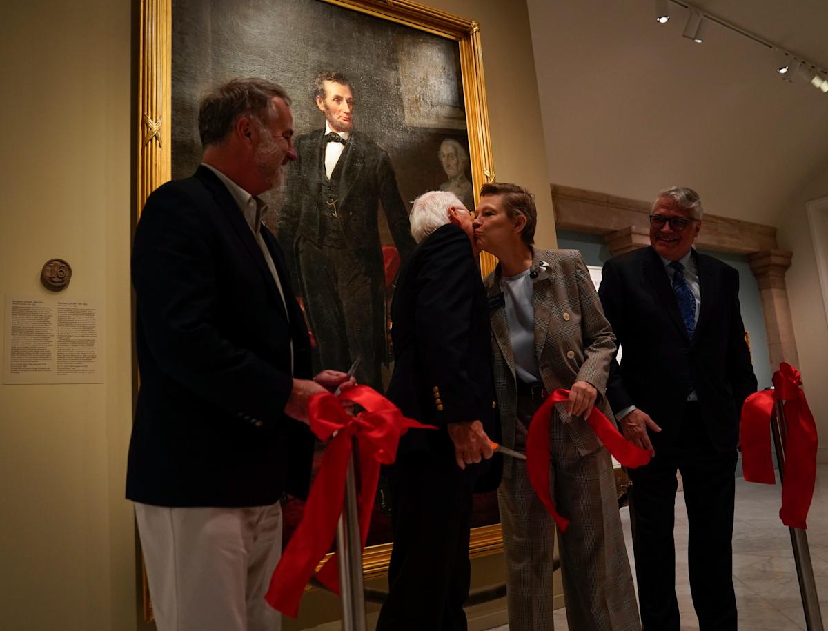 10 فبراير 2023 ؛ واشنطن العاصمة ، الولايات المتحدة الأمريكية ؛ عمدة البلدة ماديسون ، روبرت هـ. كونلي ، اليسار ، نيكولاس دبليو بلات ، رئيس مؤسسة هارتلي دودج ، كيم ساجيت ، مدير معرض صور سميثسونيان الوطني ، وجوزيف ص. Ujobai ، Right ، مجلس الأمناء في معرض الصور الوطني ، قطع الشريط الاحتفالي لتقديم اللوحة الحجم الحجم للرئيس أبراهام لنكولن من قبل الفنان WFK Travers الذي تم إنشاؤه في عام 1865 في It It Itned في المعرض الوطني في معرض واشنطن العاصمة يوم الجمعة ، 10 فبراير 2023. يأتي العمل التاريخي إلى معرض الصور الوطني على قرض طويل الأجل من مؤسسة هارتلي دودج ، التي استحوذت مؤسسها ، جيرالدين روكفلر دودج ، على اللوحة من عائلتها في ثلاثينيات القرن العشرين. الائتمان الإلزامي: جاك جروبر أوسا اليوم