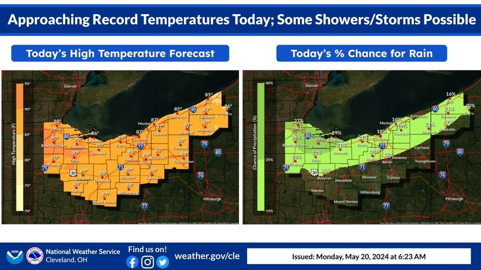 ومن المتوقع أن تصل درجة الحرارة المرتفعة اليوم إلى ما يقرب من 88 درجة في منطقة أكرون-كانتون، وفقًا لهيئة الأرصاد الجوية الوطنية.