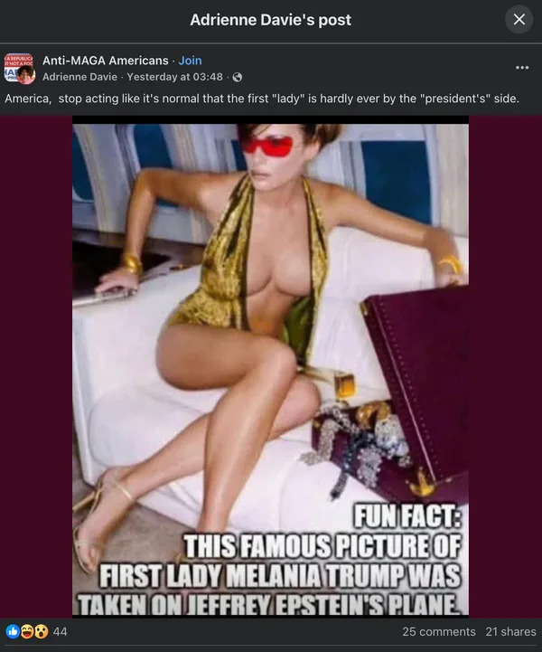 نشر العديد من مستخدمي فيسبوك الصورة (المؤرشفة، المؤرشفة)، والتي تحتوي على نص مكتوب عليه: “حقيقة ممتعة: هذه الصورة الشهيرة للسيدة الأولى ميلانيا ترامب تم التقاطها على متن طائرة جيفري إبستين”.
