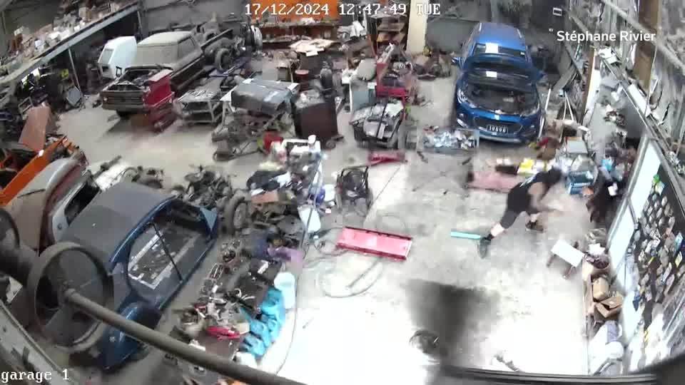 يُظهر فيديو الكاميرا الأمنية الجزء الداخلي من المرآب أثناء وقوع الزلزال، مما أدى إلى تطاير الأدوات والأثاث.