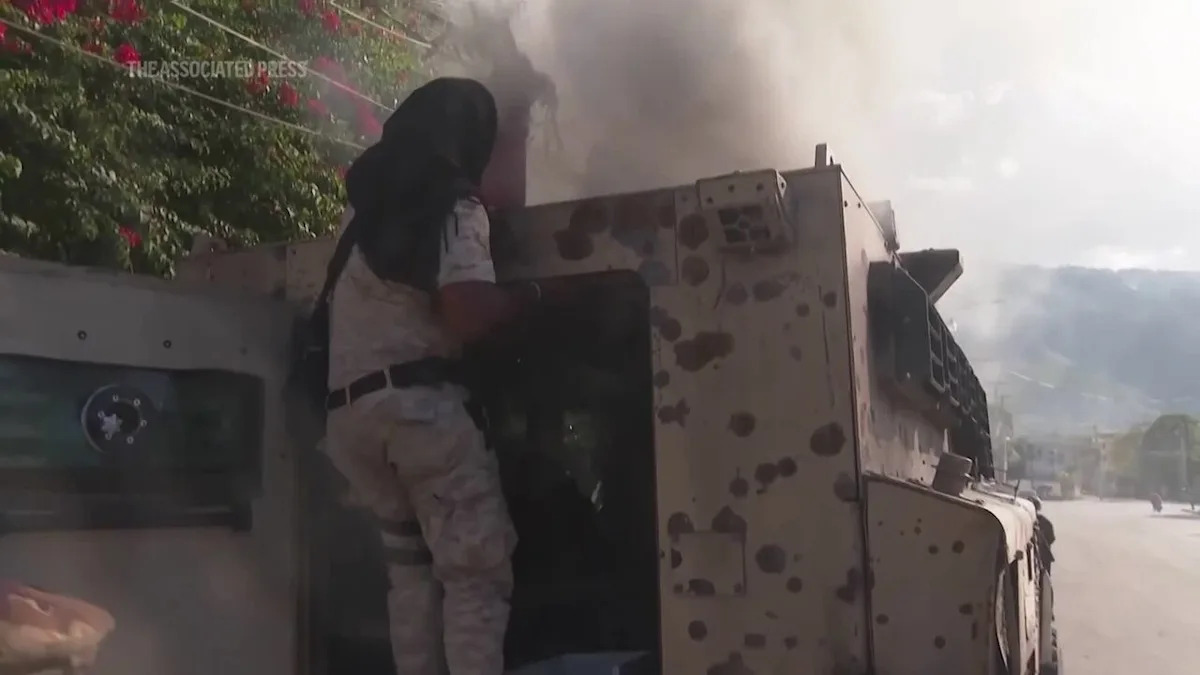 تعرضت وكالة أسوشيتد برس التابعة لوحدة شرطة متخصصة في هايتي لهجوم أثناء قيامها بدورية في شوارع العاصمة بورت أو برنس يوم الاثنين. وهزت السيارة المدرعة التي كانت تقل خمسة من ضباط الشرطة واثنين من الصحفيين وسط المدينة عندما ألقى أفراد العصابة المشتبه بهم عدة زجاجات مولوتوف عليها. (فيديو AP بواسطة بيير لوكساما)