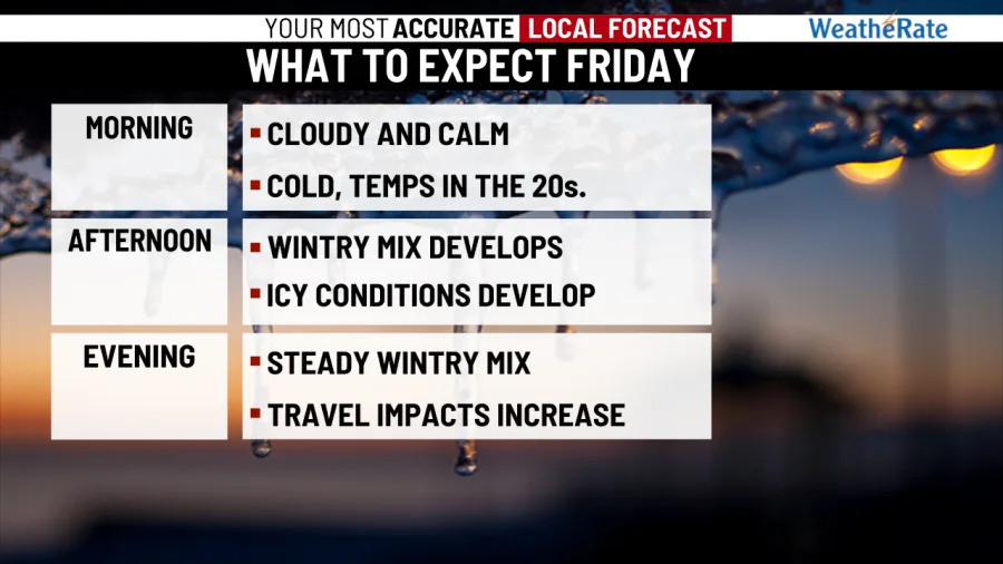 بشكل عام، يمكن أن تتعرض منطقتنا لمزيج من الثلوج والصقيع والأمطار المتجمدة. هناك أيضًا فرصة أن يبدأ صباح يوم السبت ببعض الرذاذ المتجمد في بعض المناطق. توخي المزيد من الحذر في بداية عطلة نهاية الأسبوع حيث من المتوقع أن تتأثر ظروف السفر بالمزيج الشتوي يوم الجمعة: