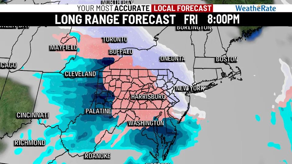 من المرجح أن يبدأ المزيج الشتوي بالثلوج والصقيع بعد ظهر الجمعة ويصبح ثابتًا مساء الجمعة. مع درجات حرارة أقل من درجة التجمد على السطح، قد تتطور الظروف الجليدية طوال مساء الجمعة وليلة الجمعة. وهذا هو الرادار المستقبلي مساء الجمعة: