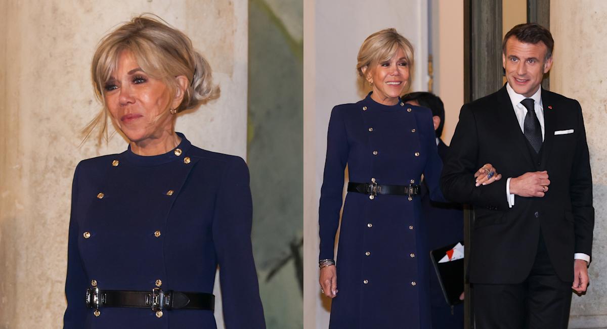تفضل بريجيت ماكرون التصميم النفعي مع حزام بيان خلال زيارة رئيس أوزبكستان باريس