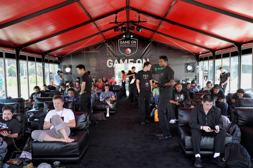 اللاعبون في Qualcomm E3 Snapdragon Gaming World Record Challenge في عام 2012 استضافته Gameon في لوس أنجلوس. سيُعرف Gameon لاحقًا باسم On Platform ، الذي تم القبض على مؤسسه بتهمة الاحتيال. (إريك ريد / أسوشيتد برس)