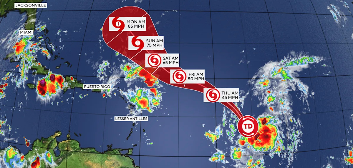 تُظهر الخريطة التي أنتجتها نولان المسار الغرب المتوقع لجابرييل خلال يوم الاثنين ، وعندها قد تكون تعبئة رياح قوات الإعصار التي تصل إلى 85 ميلاً في الساعة. يمكن أن تتطور العاصفة إلى إعصار يوم الأحد حيث تمر بالقرب من منطقة البحر الكاريبي ، وفقًا للخريطة.