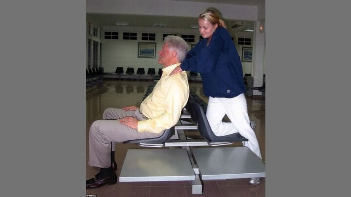 تصور صورة عام 2002 بدقة Chauntae Davies البالغة من العمر 22 عامًا ، وهي متهم لجيفري إبشتاين ، مما يمنح الرئيس السابق بيل كلينتون تدليكًا في الكتف.