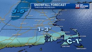 يمكن لمعظم ماساتشوستس أن ترى ما يصل إلى 3 بوصات من الثلج ، في حين أن أجزاء من الشاطئ الجنوبي والساحل الجنوبي وكيب كود والجزر ستشهد طلاءًا بنسبة 1 بوصة من الثلج.