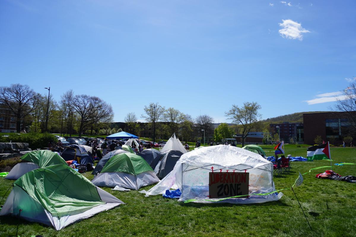 في اليوم الأخير من الدراسة في جامعة بينغهامتون صباح الخميس، انتشرت لافتات مكتوب عليها رسائل تتضمن “دع غزة تعيش” و”اليهود من أجل فلسطين” في خيمة في ساحة السلام بالحرم الجامعي. وهناك لافتة أخرى رفعها طالب يجلس على صخرة على بعد عدة ياردات، على مشارف العشب، كُتب عليها “لا تنسوا أبدًا مذبحة 7 أكتوبر”.