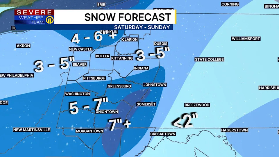 وخلف الثلوج، ستنخفض قشعريرة الرياح إلى ما دون الصفر في وقت متأخر من هذه الليلة ويمكن أن تصل درجة البرودة إلى -10 درجات صباح الأحد. بالإضافة إلى تساقط الثلوج الليلة، ستبدأ زخات الثلوج بتأثير البحيرة يوم الأحد، خاصة شمال بيتسبرغ، حيث من المتوقع تراكم المزيد من الثلوج.