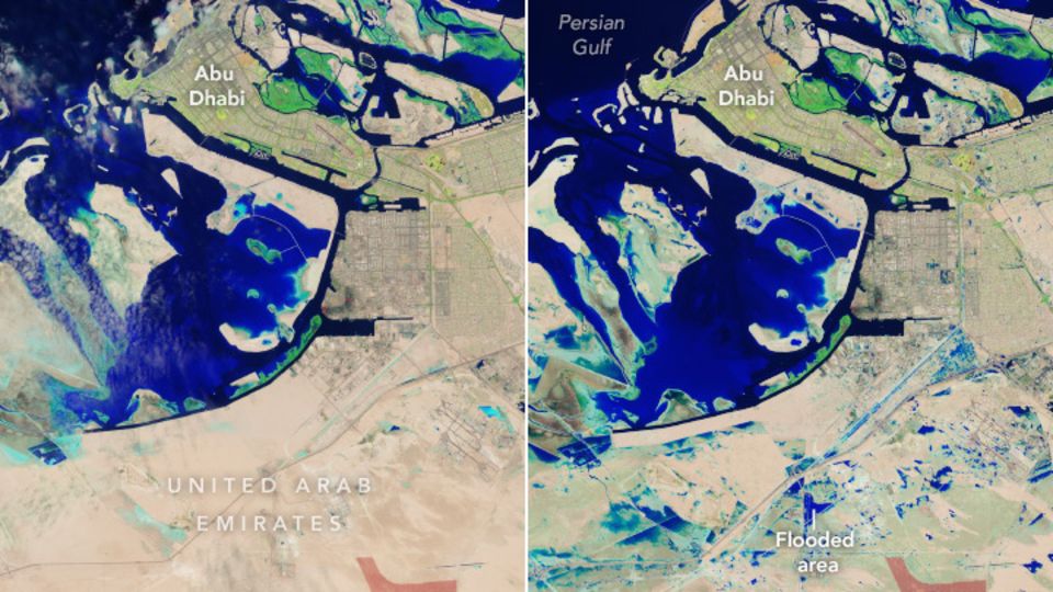 كما التقط القمر الصناعي فيضانات كبيرة في أبوظبي. تظهر المسطحات المائية الصغيرة الضحلة باللون الأزرق الفاتح. أما البرك الأكبر والأعمق من مياه الفيضانات فهي ذات لون أزرق داكن.