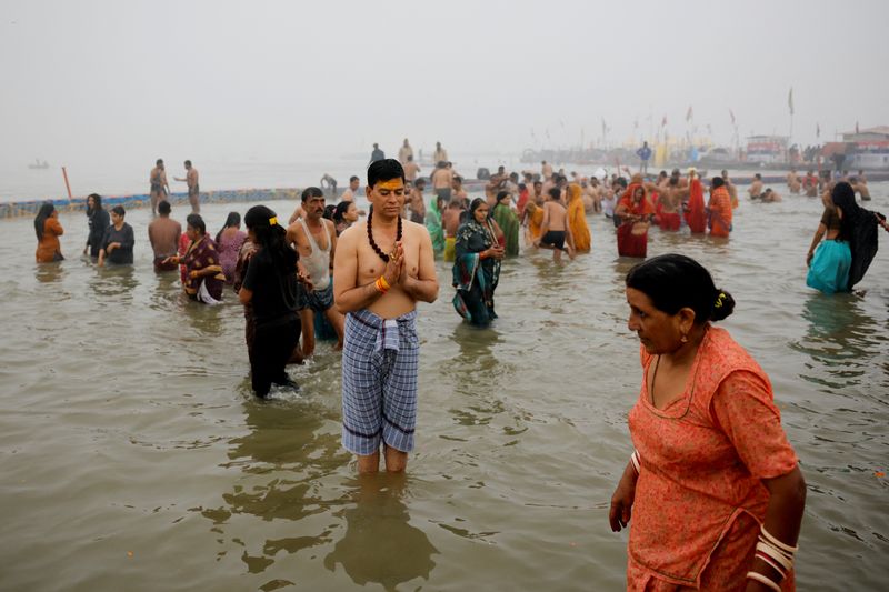 برايراج (الهند) (رويترز) – غطس عشرات الآلاف من الهندوس الذين يسعون للخلاص من خطاياهم يوم الاثنين في المياه المتجمدة عند ملتقى الأنهار المقدسة في الهند مع بدء مهرجان يستمر ستة أسابيع من المتوقع أن يجذب أكبر تجمع للبشرية في العالم.