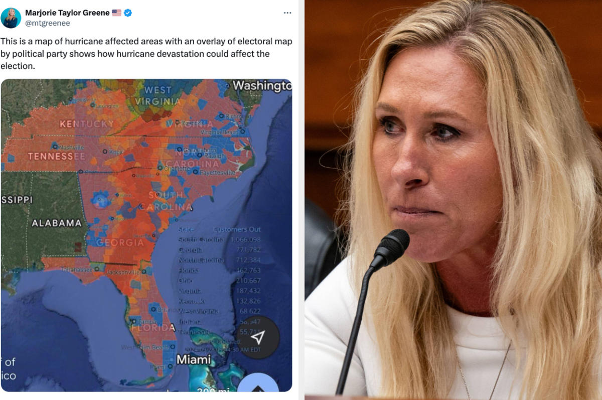 شاركت مارجوري تايلور جرين خريطة توضح تراكب الخريطة الانتخابية حسب الحزب السياسي مقارنة بالمناطق المتضررة من الإعصار.