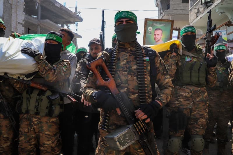 يعرض إرهابيو حماس الفلسطينيين وهم يستعدون لتسليم الرهائن الذين تم اختطافهم خلال 7 أكتوبر 2023 ، هجوم على إسرائيل من قبل حماس ، إلى الصليب الأحمر كجزء من وقف إطلاق النار ومبادلة رهينة من السجن بين حماس وإسرائيل ، في مدينة غزة ، 19 يناير 2025.
