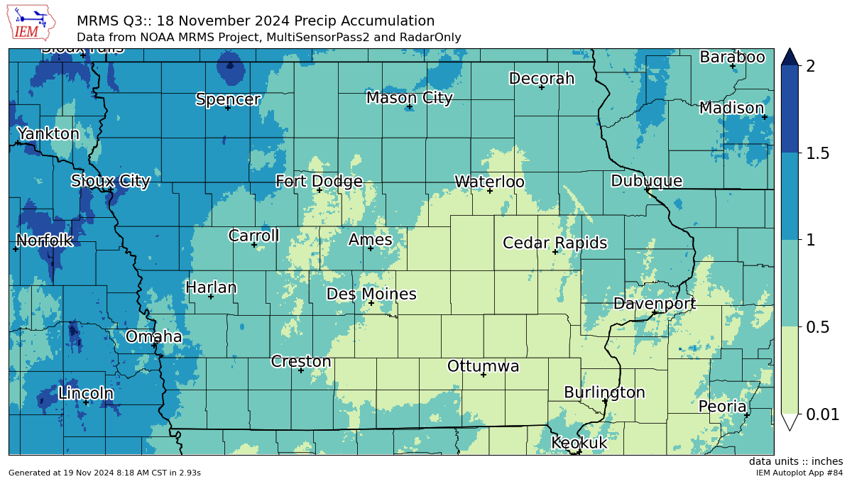 إجمالي هطول الأمطار في ولاية أيوا من 18 نوفمبر حتى 19 نوفمبر.