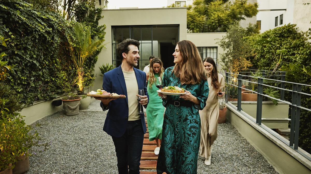 أشخاص يحملون أطباقًا بالخارج لتناول العشاء في المنزل – توماس بارويك / غيتي إيماجز