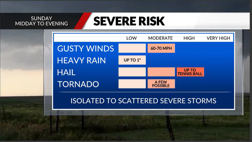 بعد ظهر يوم الأحد – في وقت مبكر من المساء: ذروة تهديد الطقس القاسي ، مع إمكانية الرياح الضارة ، البرد الكبير ، والأعاصير المعزولة.