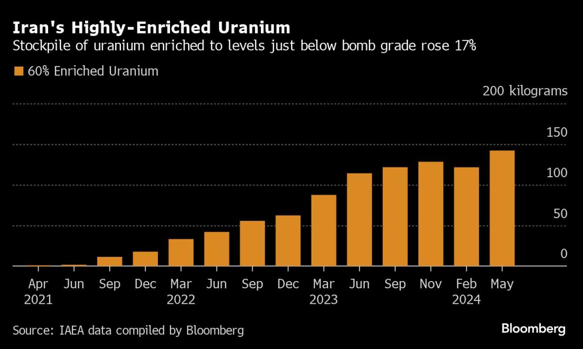 تحقق مفتشو الوكالة الدولية للطاقة الذرية يوم الاثنين من أن مخزون إيران من اليورانيوم عالي التخصيب ارتفع بنسبة 17٪ خلال الأشهر الثلاثة الماضية، وفقًا لتقرير مقيد من تسع صفحات تم توزيعه بين الدبلوماسيين واطلعت عليه بلومبرج. وهذا يكفي من اليورانيوم لتزويد عدد من الرؤوس الحربية بالوقود، في حال اتخذت إيران قراراً سياسياً بالسعي إلى إنتاج أسلحة نووية.