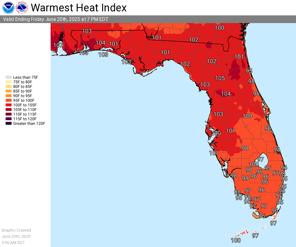 تُظهر توقعات الحرارة في 20 يونيو 2025 من خدمة الطقس الوطنية مؤشرات الحرارة القصوى لأكثر من 100 في معظم فلوريدا.