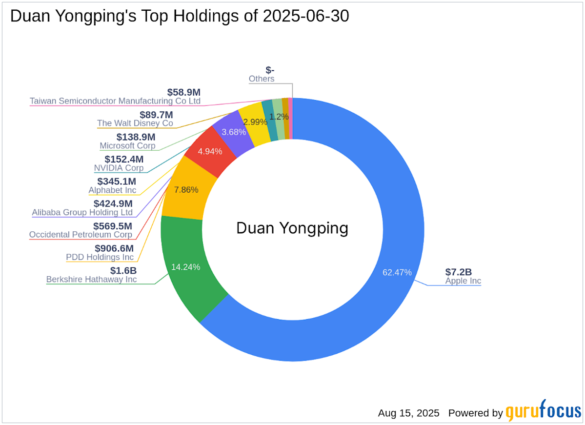 في الربع الثاني من عام 2025 ، شملت محفظة Duan Yongping (Trades ، Portfolio) 10 أسهم. تضمنت أعلى المقتنيات 62.47 ٪ في Apple Inc (NASDAQ: AAPL) ، 14.24 ٪ في Berkshire Hathaway Inc (NYSE: BRK.B) ، 7.86 ٪ في PDD Holdings Inc (NASDAQ: PDD) ، 4.94 ٪ في Occidental Petroleum Corp: NYSE) و 3.68 ٪ في ALIBA.