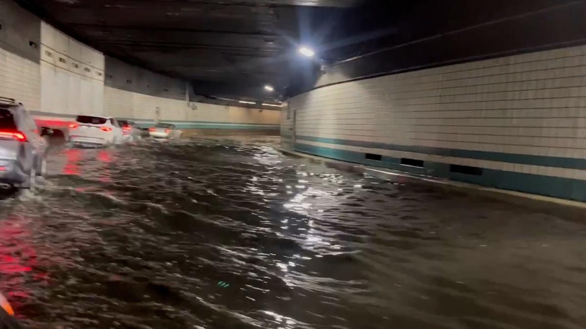 ويظهر مقطع فيديو أشخاصا يقودون سياراتهم ببطء عبر النفق بينما تصل المياه المظلمة إلى منتصف الطريق فوق إطارات سياراتهم. تلتصق السيارات بجانب واحد من النفق، حيث يبدو مستوى المياه أقل عمقًا.