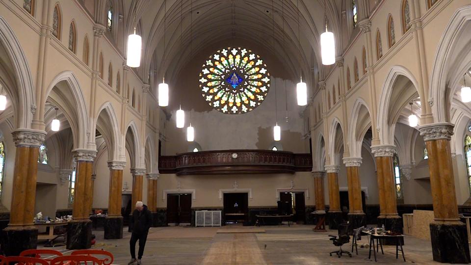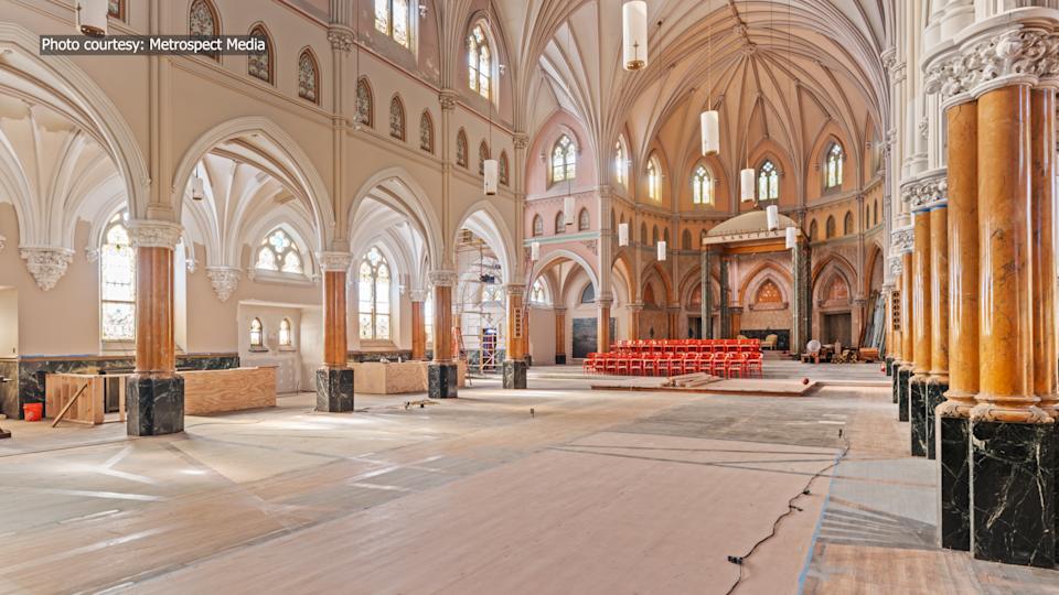 تضم الكنيسة ثلاثة نوافذ وردية ، وسقف 60 قدمًا ، ومقاعد لأكثر من 1000 شخص. يتمتع العقار بإمكانية التحول إلى مساحة حدث أو مطعم أو مساحة إبداعية ، وفقًا للقائمة.