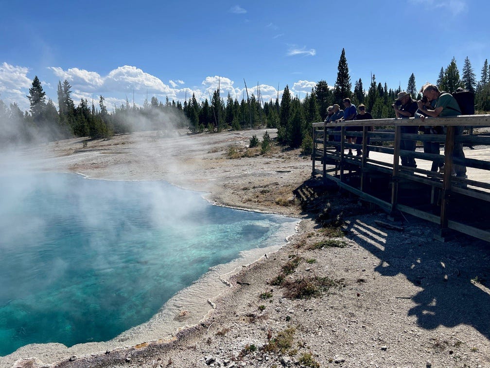 يُطلب من الزائرين البقاء على الممرات الخشبية ليس فقط لحماية أنفسهم، ولكن أيضًا لحماية الخصائص الحرارية الهشة لمتنزه يلوستون الوطني.