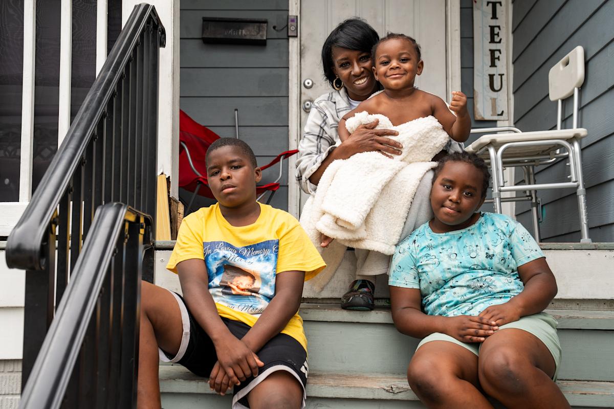 تطرح Lakisha Catchings ، 44 عامًا ، صورة مع أطفالها Ohsua ، 2 ، يعقوب ، 11 ، وكاشاي 10 ، أمام منزلهم في حي وسط مدينة نيو أورليانز.