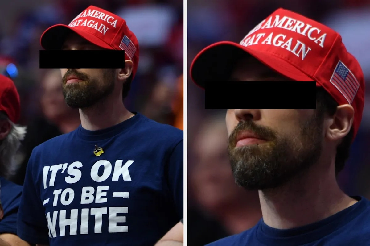 شخص يرتدي أ "جعل أمريكا عظيمة مرة أخرى" كاب و "لا بأس أن تكون أبيضًا" تي شيرت في حدث ما؛ العيون مظلمة في الصورة