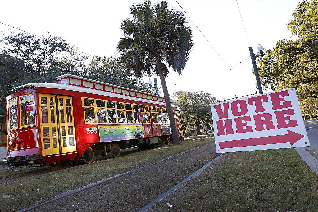 تتدحرج سيارة ترام في منطقة تصويت في نيو أورليانز. (تصوير جوناثان باخمان/غيتي إيمايز)