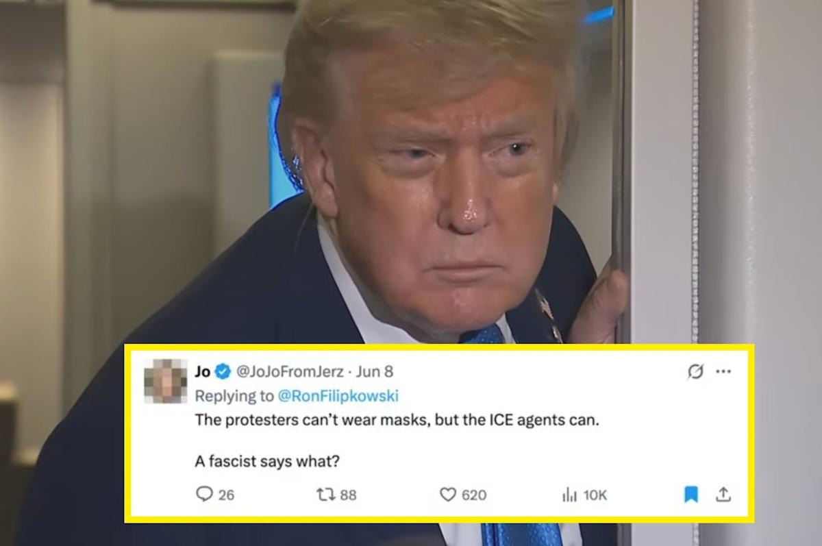 أجاب هذا الشخص على تعليق ترامب بأن المتظاهرين لديهم شيء “يختبئهم” خلف الأقنعة ويسألون: “لماذا لا تسأل وكلاء الجليد المقنعين الذين هم أيضًا في ملابس واضحة ويفشلون في التعرف على أنفسهم؟”