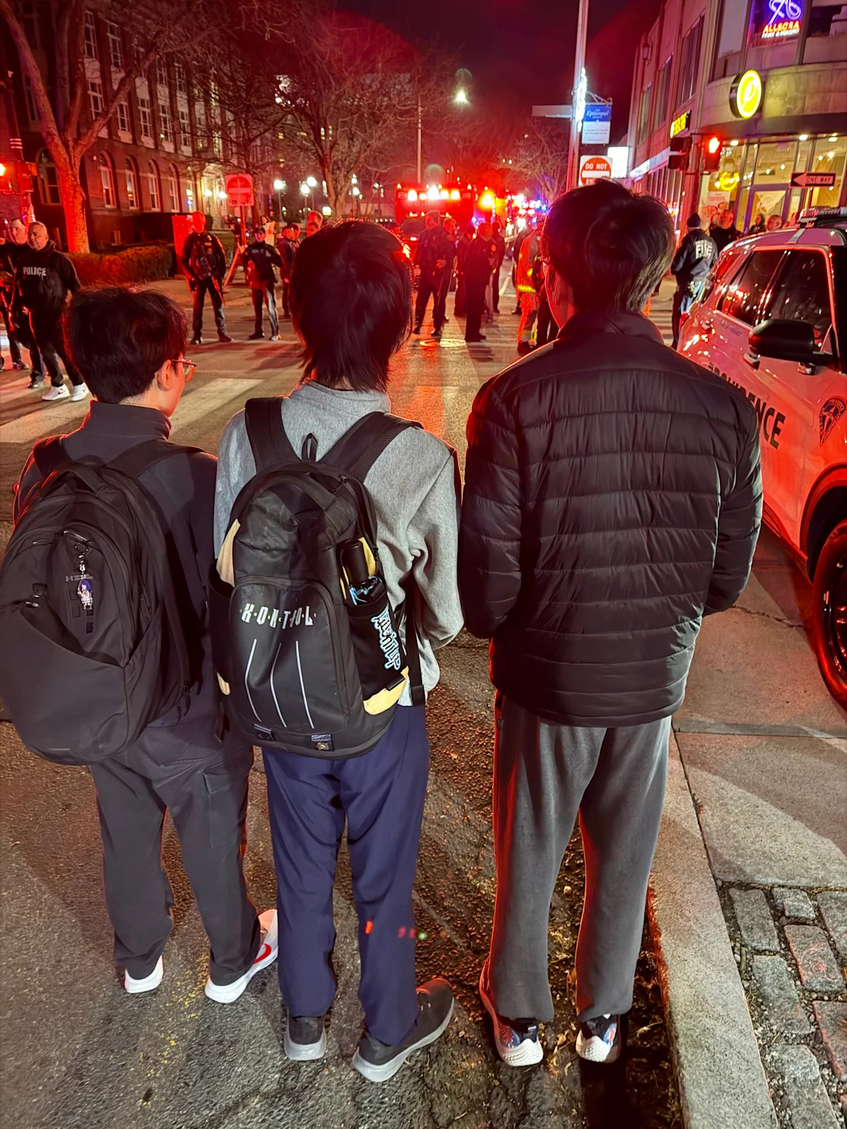 كان الطلاب الثلاثة الذين أجريت معهم مقابلات لطيفين بما يكفي لالتقاط صورة لهم وظهورهم للكاميرا، ولكن بعد ذلك مباشرة، أعلنت الشرطة أنها ستبعد الجميع عن التقاطع وتوسع شريط الشرطة، لذلك كان علينا المضي قدمًا.