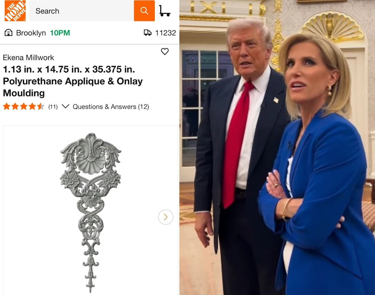 وقد لاحظ بعض المشاهدين شديدي البصر أن نفس التطعيمات المقولبة، الملتصقة الآن بجدران المكتب البيضاوي، نكون تم بيعها بالفعل في Home Depot مقابل 58.07 دولارًا أمريكيًا للبوب، على الرغم من أنها لم يتم طلاءها بالذهب بعد. أمم.
