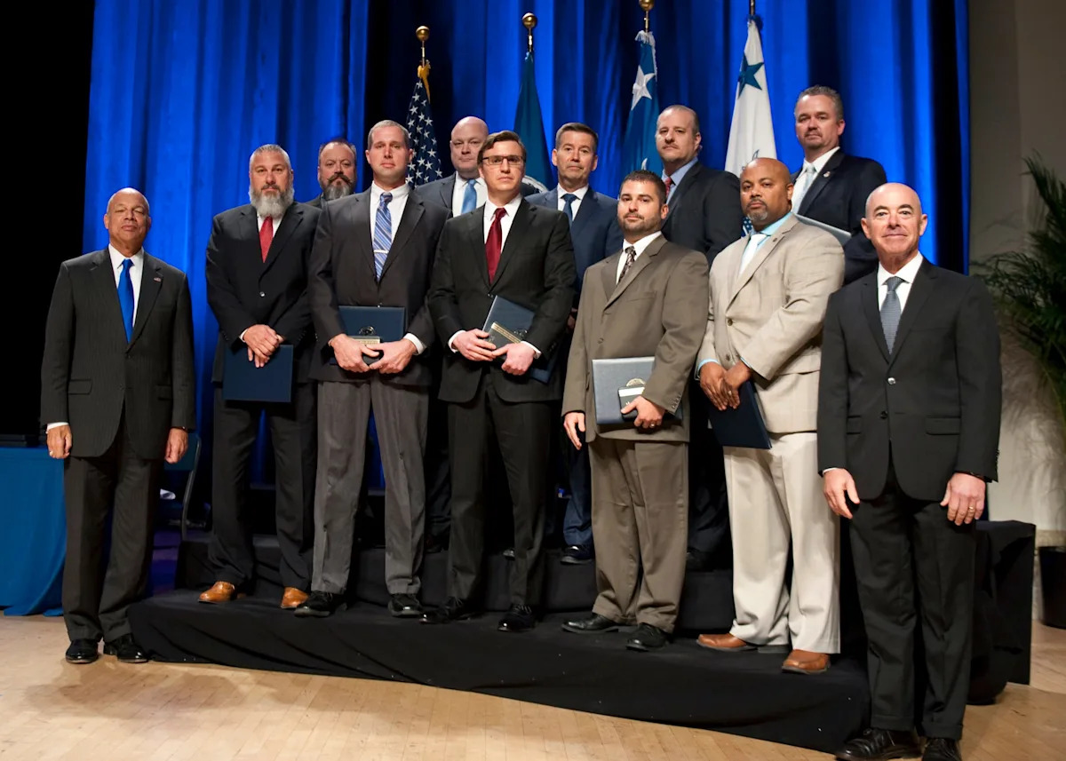 حصل صامويل إل. ساكسون، الذي يظهر في الصورة في الصف الأمامي وهو يرتدي نظارات وربطة عنق حمراء، على وسام الخدمة الجديرة بالتقدير من الوزير في عام 2016 لخدمته في وزارة الأمن الداخلي.
