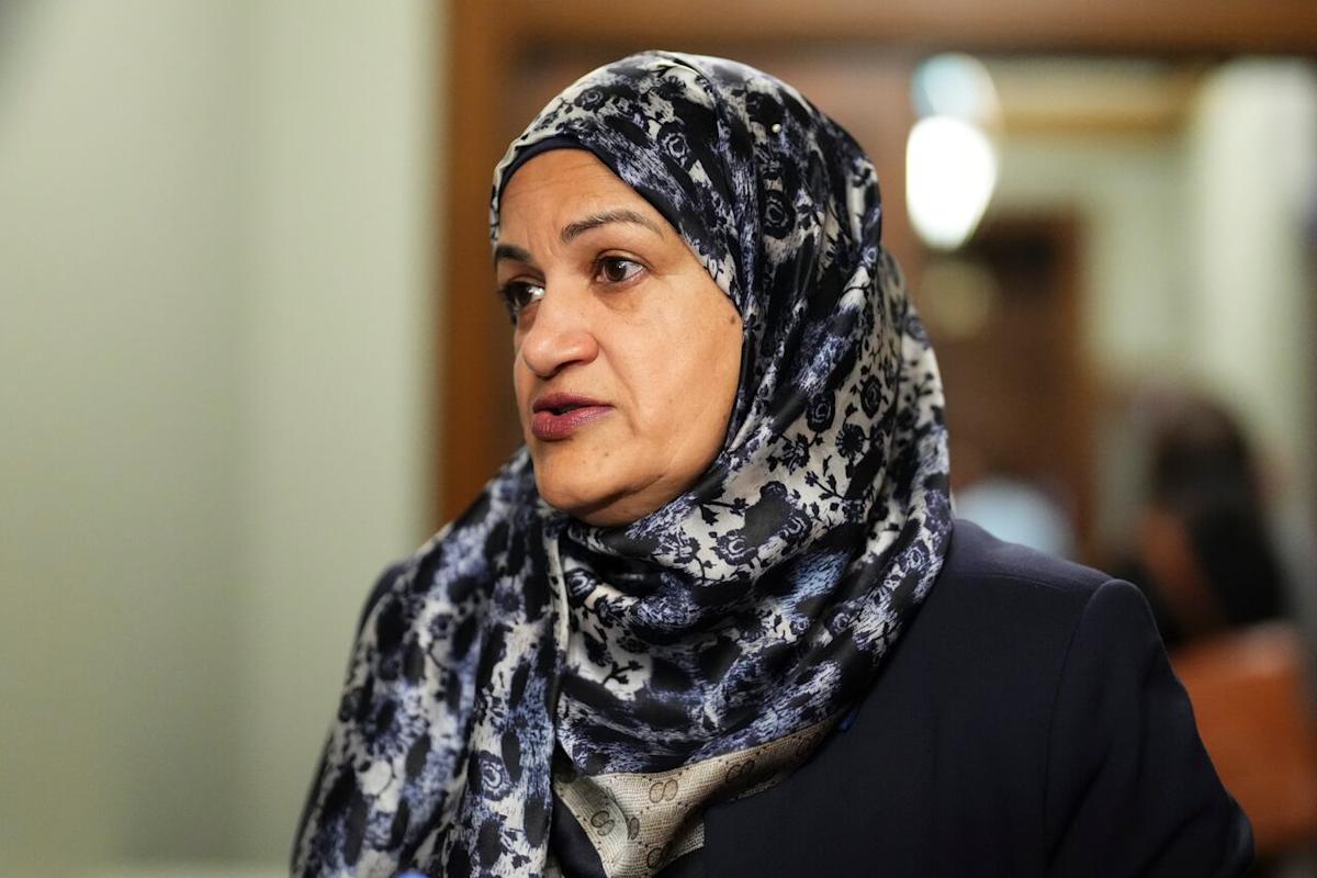 تتحدث العضو الليبرالي في البرلمان سلمى زاهد إلى الصحفيين عند وصولها إلى اجتماع تجمع في أوتاوا يوم الأربعاء ، 8 نوفمبر 2023.