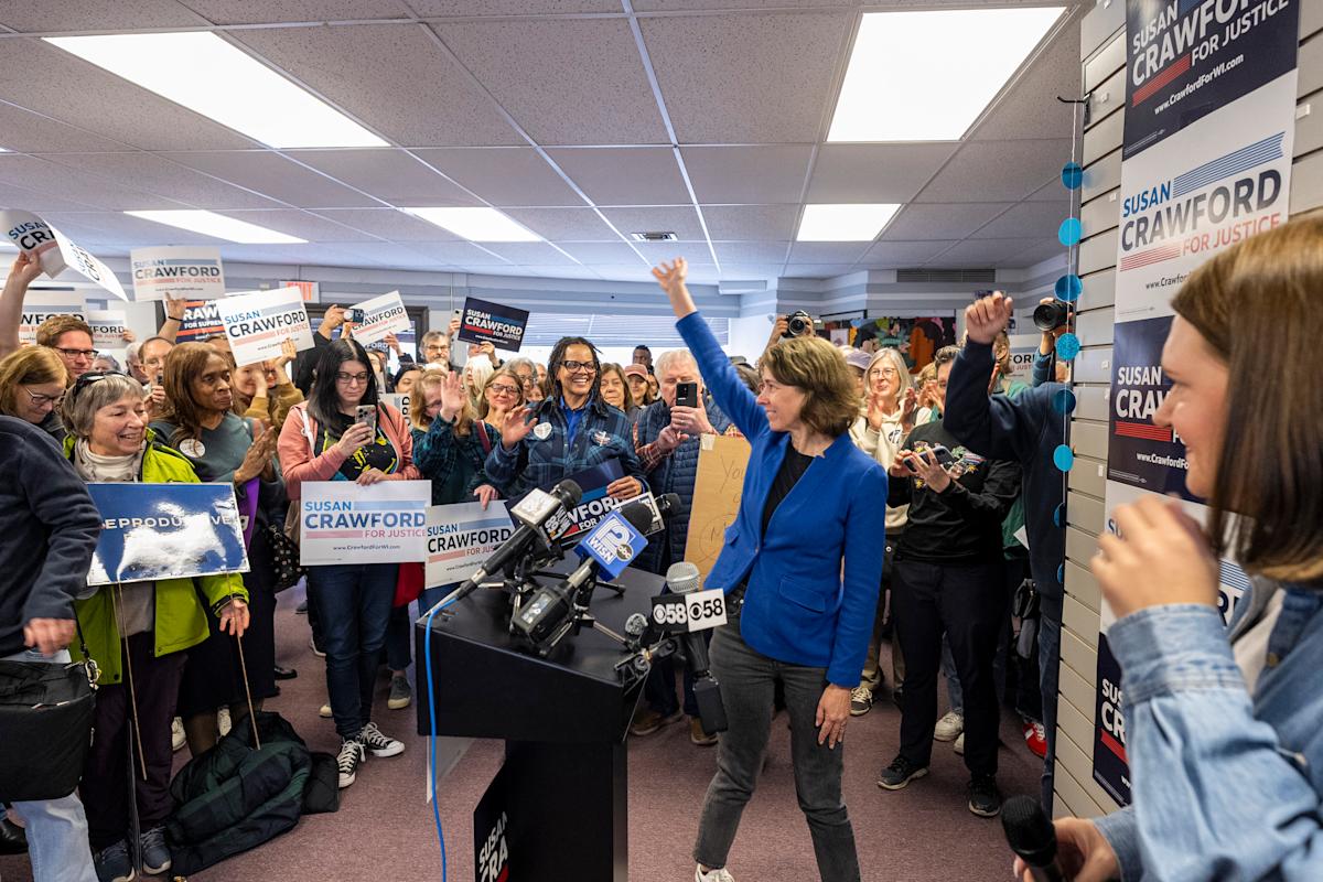 أصبح سباق المخاطر العالية معركة وكيل حول سياسة الأمة ، حيث يحاول كروفورد والديمقراطيين جعلها استفتاء على المسك بالنظر إلى مشاركته العميقة في المسابقة. لقد جمع هو ومجموعتان من أمواله لإنفاق أكثر من 21 مليون دولار على السباق الذي سيحدد سيطرة الأغلبية على المحكمة ، بناءً على مركز برينان للعدالة.