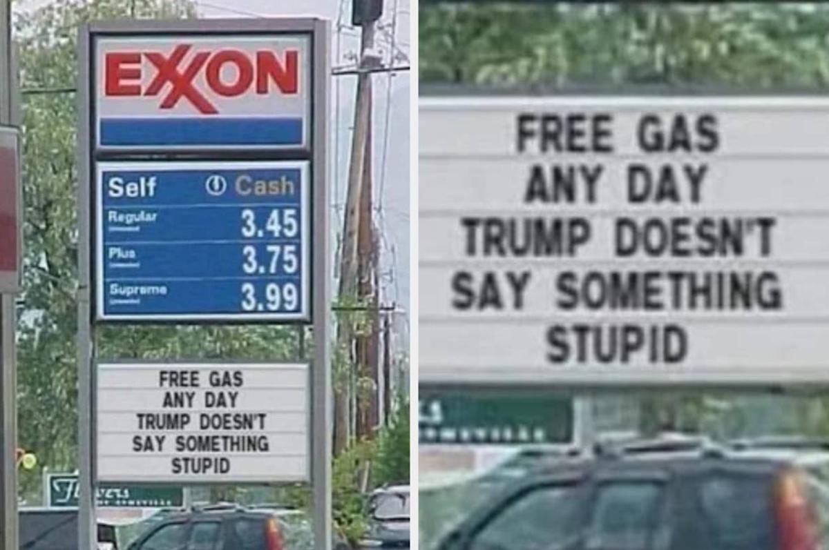 تُظهر علامة محطة الوقود الأسعار والقراءات: "غاز مجاني في أي يوم لا يقول ترامب شيئًا غبيًا."