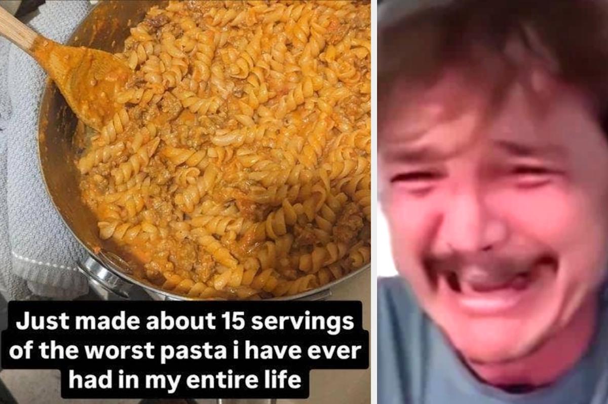 وعاء من المعكرونة مع صلصة اللحوم وملعقة خشبية. يقرأ النص “صنعت للتو حوالي 15 حصصًا من أسوأ المعكرونة التي مررت بها في حياتي كلها.”