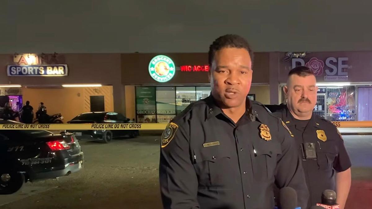 الصورة: مساعد رئيس جيمس سكيلتون من الصحفيين في قسم شرطة هيوستن ، 23 مارس 2025 ، في إطلاق نار في شريط لاتيني الرياضي خلفه خلفه ستة أشخاص أصيبوا. (قسم شرطة هيوستن)