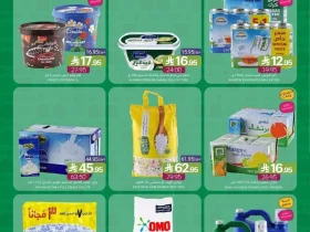 عروض أبراج هايبر ماركت تضمنت عروضا مميزة على المواد الغذائية اليومية مثل معكرونة الشعيرية الطويلة وصلصة الطماطم الإيطالية والبقوليات المعلبة مثل الحمص والفاصوليا البيضاء بالإضافة إلى الزبادي بنكهات الفواكه الموسمية والمربى الطبيعي والمياه الغازية