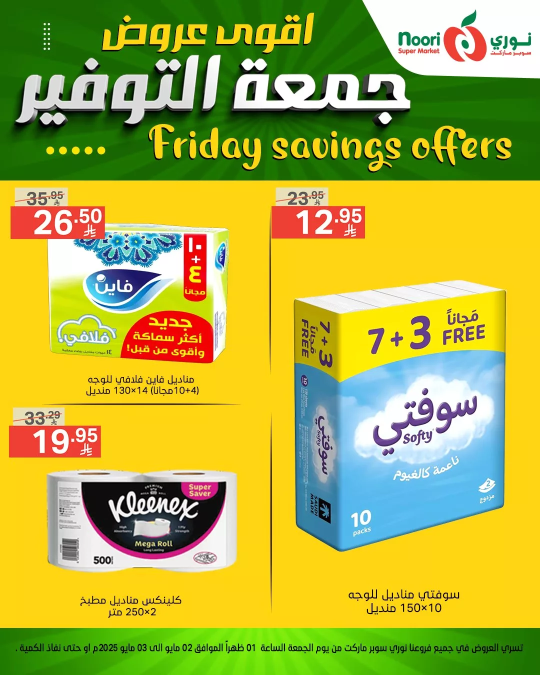 تبدأ عروض جمعة التوفير من نوري سوبر ماركت يوم الجمعة الموافق 2 مايو 2025 الساعة 01 ظهرًا، وتنتهي يوم السبت 3 مايو 2025، أو حتى نفاد الكمية