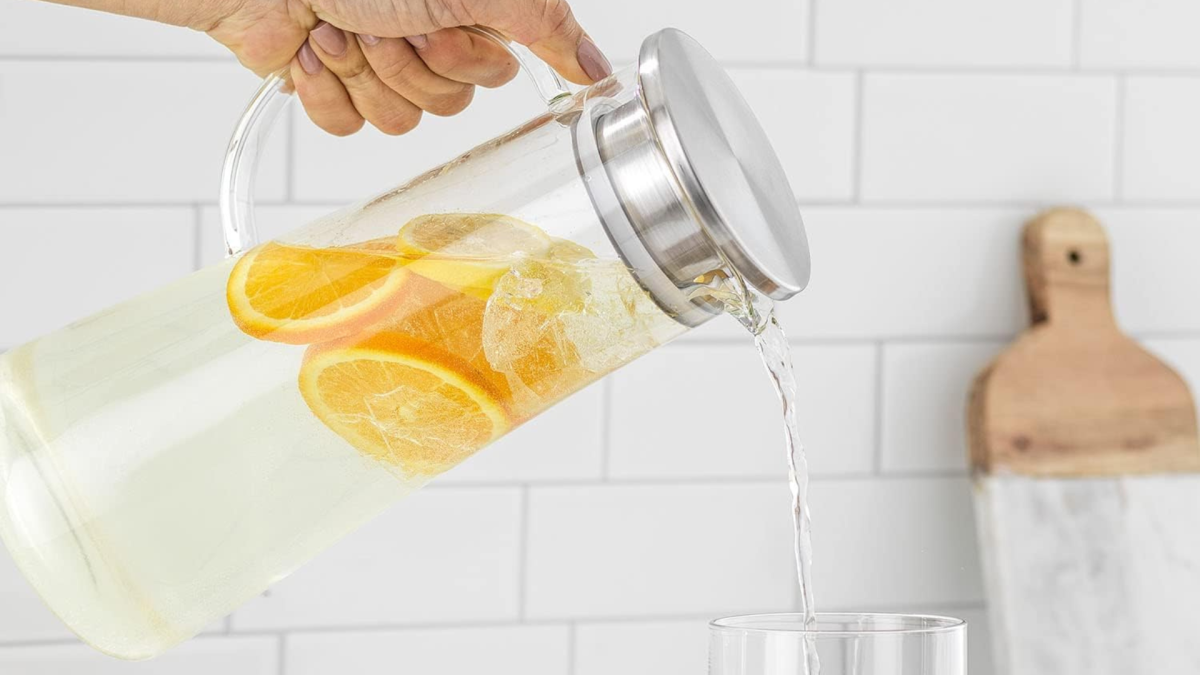 على الرغم من أنه يشبه زجاج الماء العملاق تمامًا – والذي يمكن مقارنته بحجم بهلوان ستانلي – إلا أنني انجذبت نحو إبريق JoyJolt Glass Pitcher سعة 50 أونصة بسبب غطاءه. تحتوي الطبقة العلوية المصنوعة من الفولاذ المقاوم للصدأ على سدادة مطاطية لمنعها من التسرب، وفتحتين: فوهة صب واسعة وفوهة فلتر. عندما أسكب الماء، يمنع فوهة الفلتر البذور أو اللب أو حتى قطع الفاكهة الصغيرة من الخروج من الإبريق. وعندما أنتهي من شرب الـ50 أونصة كلها، أعيد استخدام الفاكهة لمدة تصل إلى 24 ساعة وأعيد ملء الإبريق بمزيد من الماء. (لمعلوماتك، أقوم باستبدال مصفاة الفاكهة كل يوم.)