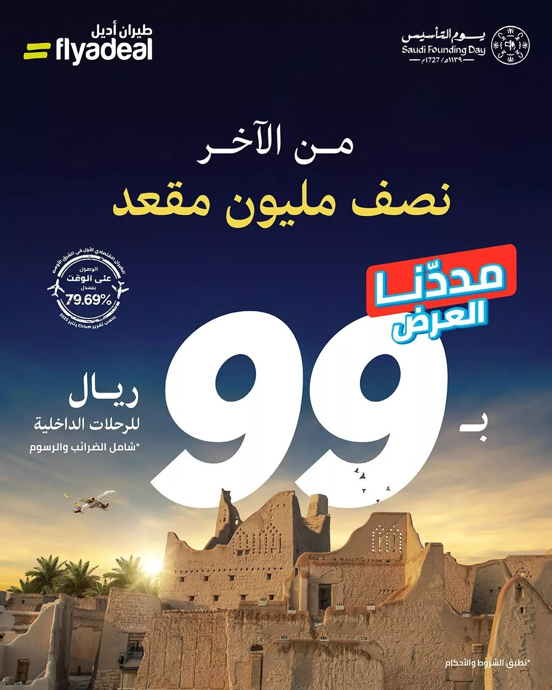 إذا كنت ترغب في الاستمتاع برحلات داخلية بأسعار لا تُصدق خلال احتفالات يوم التأسيس السعودي 2025، فإن عرض طيران أديل بـ99 ريال للرحلة الداخلية هو الخيار الأمثل. اغتنم الفرصة الآن، احجز مقعدك، واستعد لتجربة سفر ممتعة ومريحة مع عائلتك أو أصدقائك. لا تدع هذه الفرصة الذهبية تفوتك!