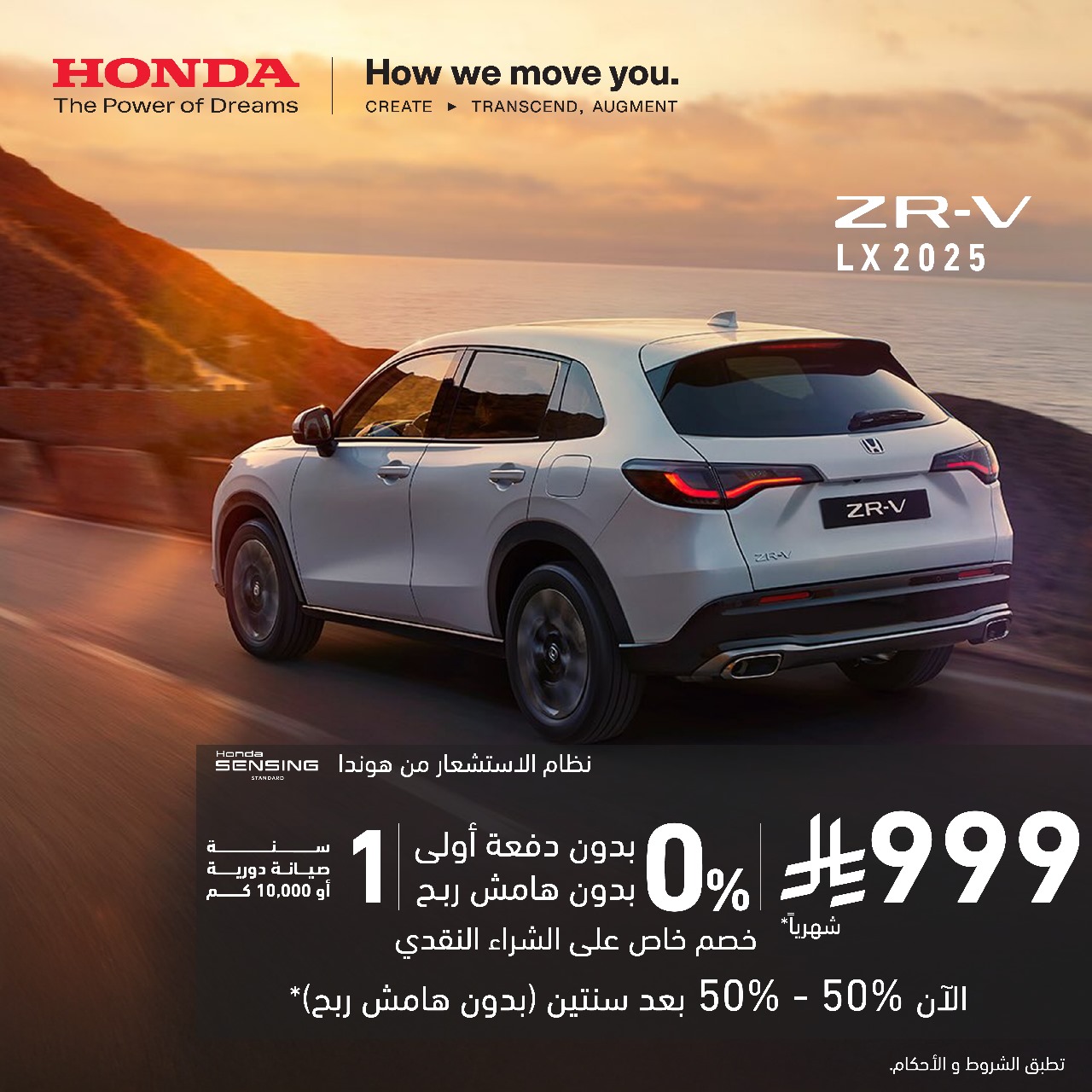عروض هوندا ZR-V LX 2025 تمنحك تجربة قيادة متكاملة تجمع بين الأداء والتقنية المتطورة العرض الجديد من هوندا السعودية يقدم لكل من يبحث عن سيارة دفع رباعي متكاملة بسعر مميز وبتسهيلات استثنائية تجعل من التملك امرا سهلا جدا لا تفوتوا هذه العروض الحصرية في هوندا السعودية