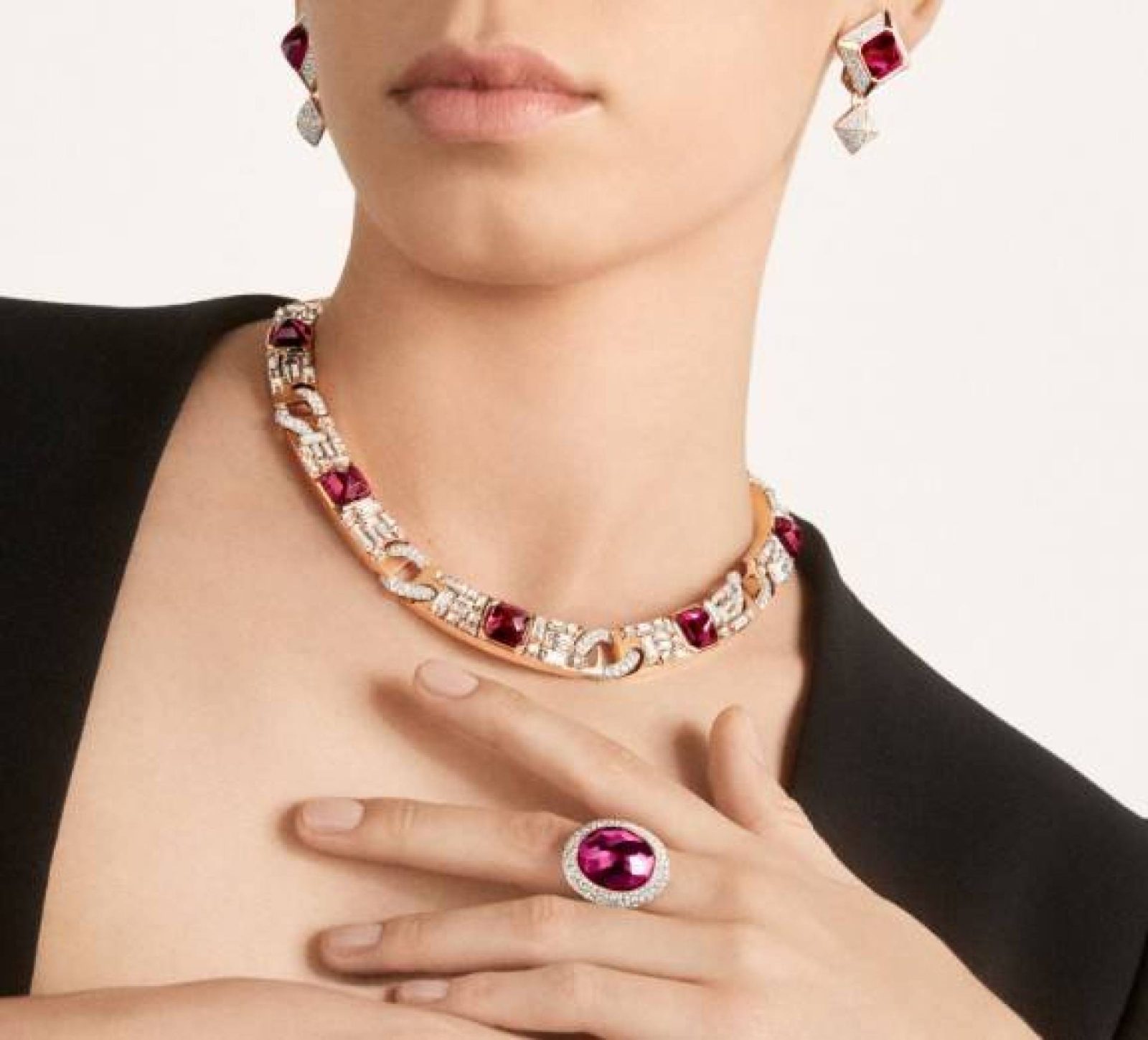 تصميم لافت من Pomellato مصنوع من الذهب عيار 18 قيراطاً ومزيّن بأحجار الروبي الحمراء والماس الناعم. يذكّرنا هذه التصميم بإطلالات الملكات خلال الأيام الماضية، وهو سيليق حتماً بعباءتك الشرقية الجميلة.
